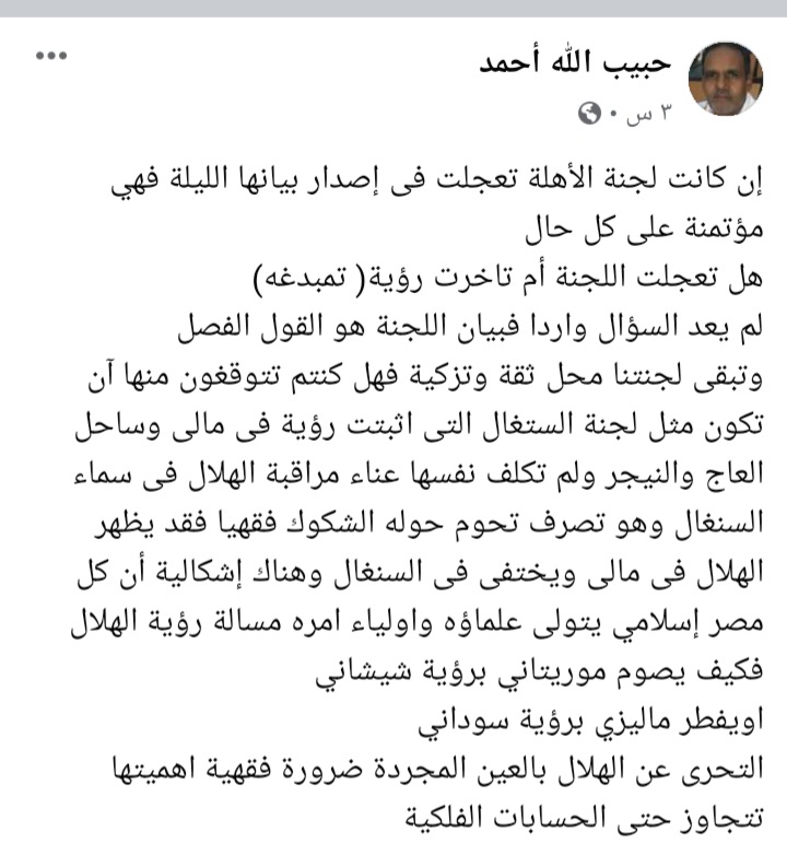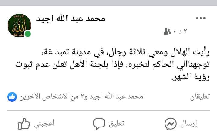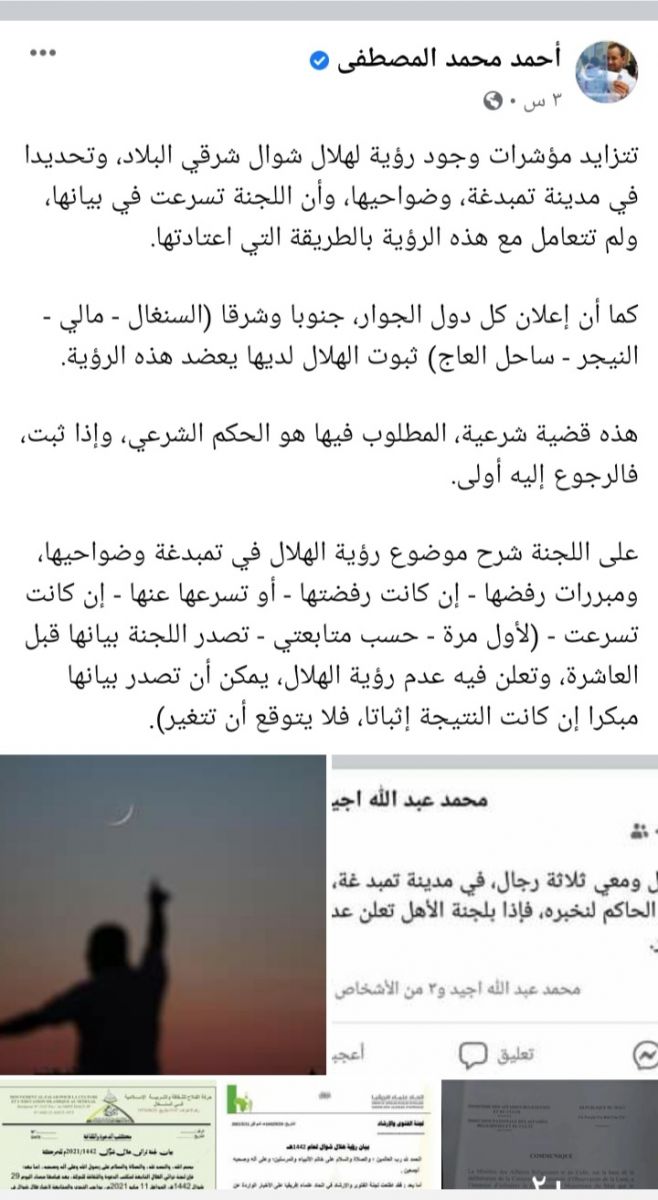 تتزايد مؤشرات وجود رؤية لهلال شوال شرقي البلاد، وتحديدا في مدينة تمبدغة، وضواحيها، وأن اللجنة تسرعت في بيانها، ولم تتعامل مع هذه الرؤية بالطريقة التي اعتادتها.