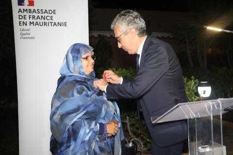 وشح السفير الفرنسي بنواكشوط روبرت مولييه باسم رئيس الجمهورية الفرنسية مساء الخميس 12 مايو 2022 بمقر السفارة بوسام فارس فاطمة عبد المالك رئيسة جهة نواكشوط.