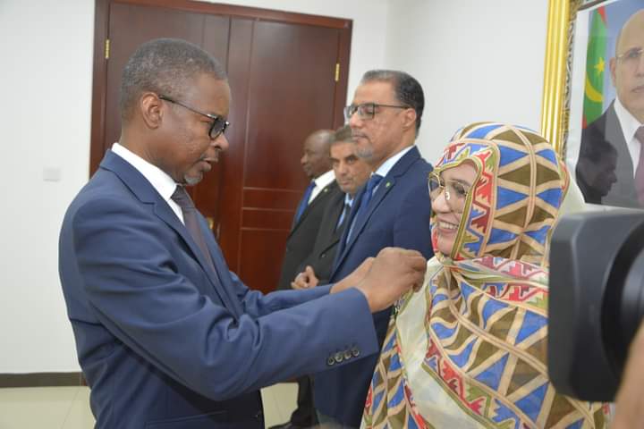 السيدة أمته بنت الحاج، مستشارة الوزير الأول بالمكلفة بالأمن الغذائي بوسام فارس من الاستحقاق الوطني؛