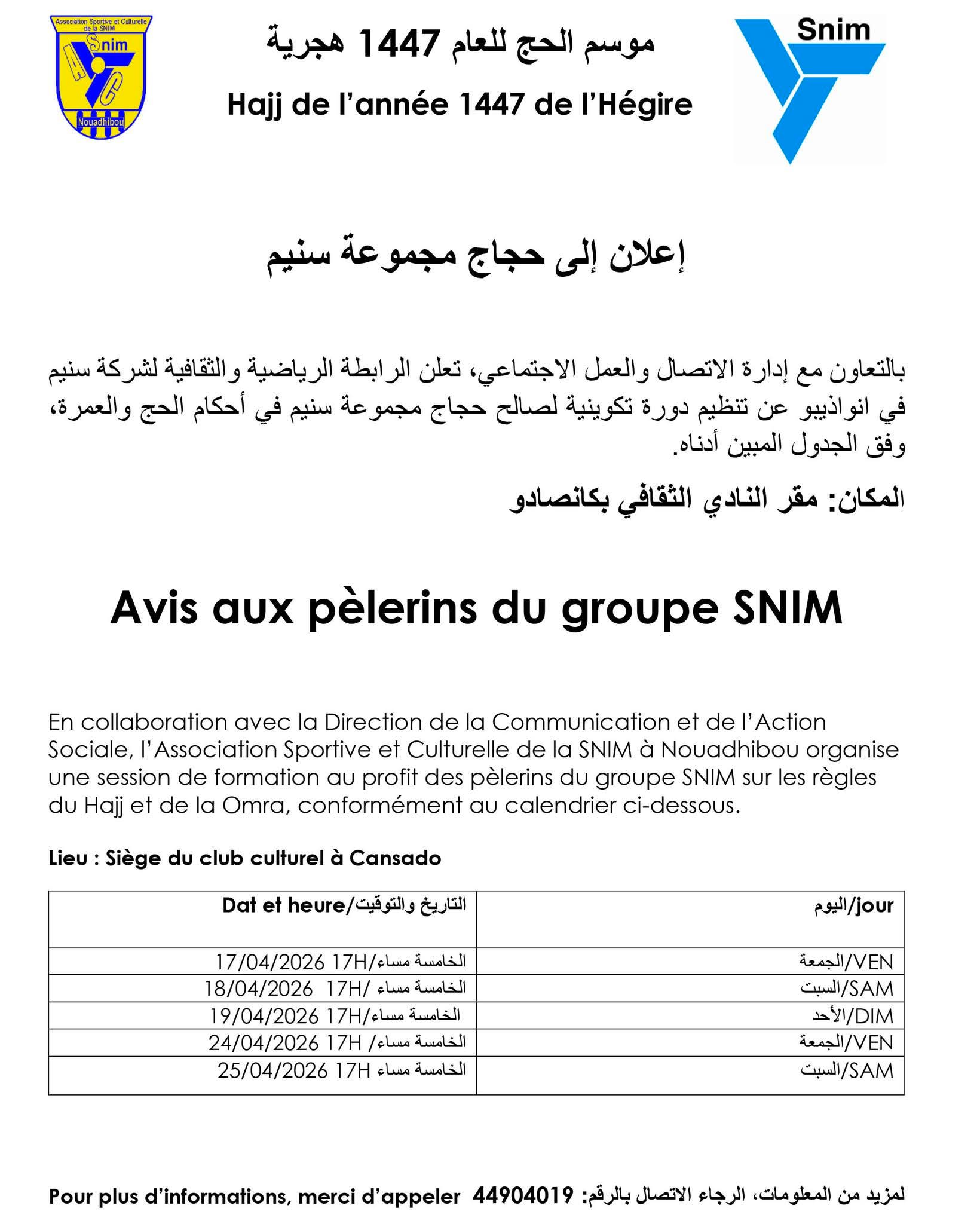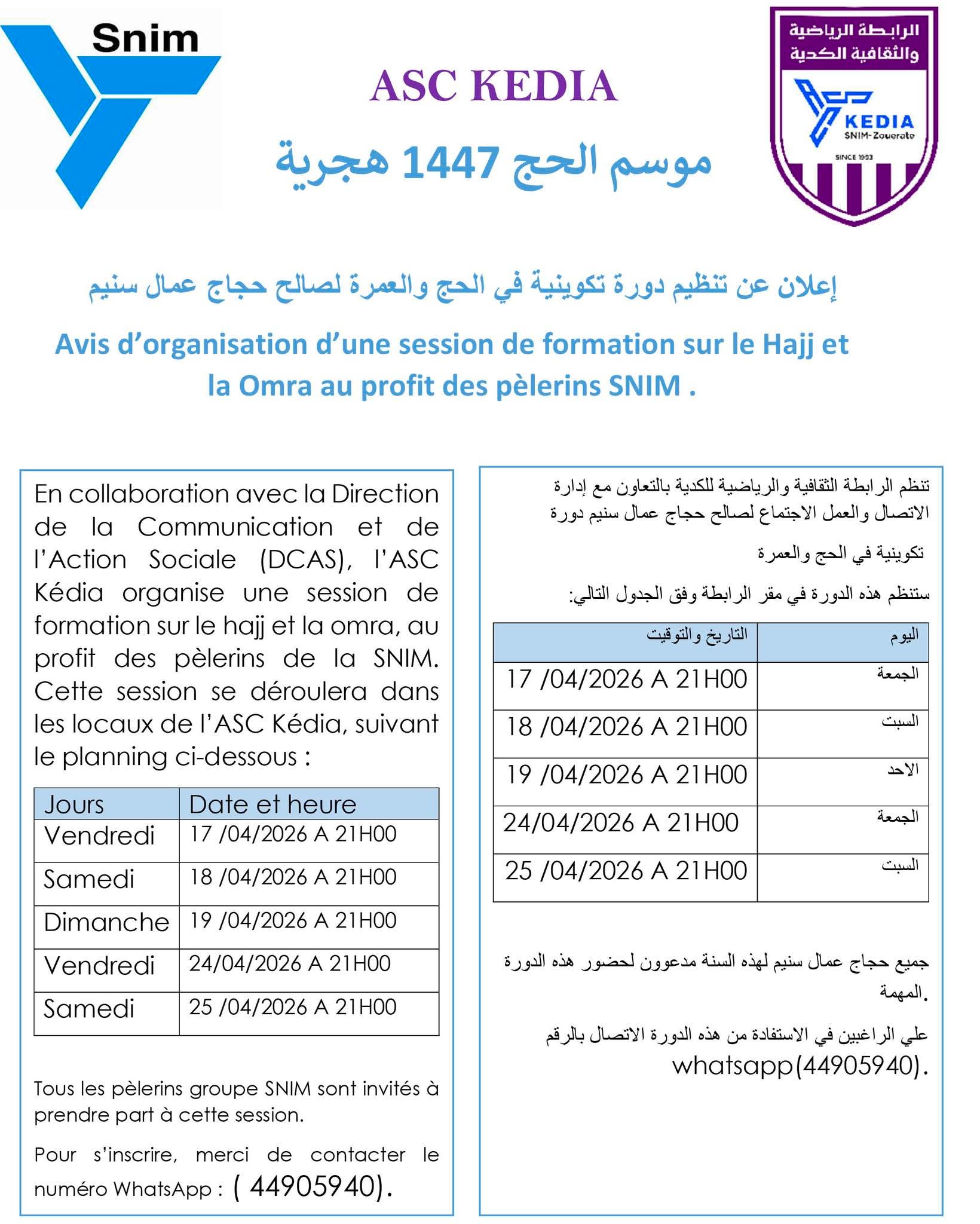أعلنت الرابطة الثقافية والرياضية الكدية والرابطة الرياضية والثقافية لشركة سنيم، بالتعاون مع إدارة الاتصال والعمل الاجتماعي في الشركة الوطنية للصناعة والمناجم سنيم، عن تنظيم دورة تكوينية حول أحكام الحج والعمرة لصالح حجاج عمال الشركة خلال الموسم الحالي.